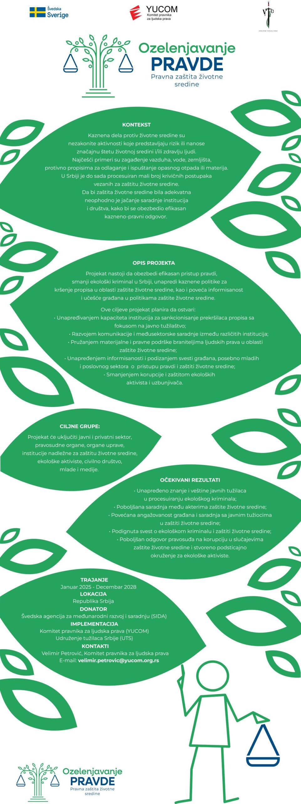 Projekat nastoji da obezbedi efikasan pristup pravdi, smanji ekološki kriminal u Srbiji, unapredi kaznene politike za kršenje propisa u oblasti zaštite životne sredine, kao i poveća informisanost i učešće građana u politikama zaštite životne sredine.